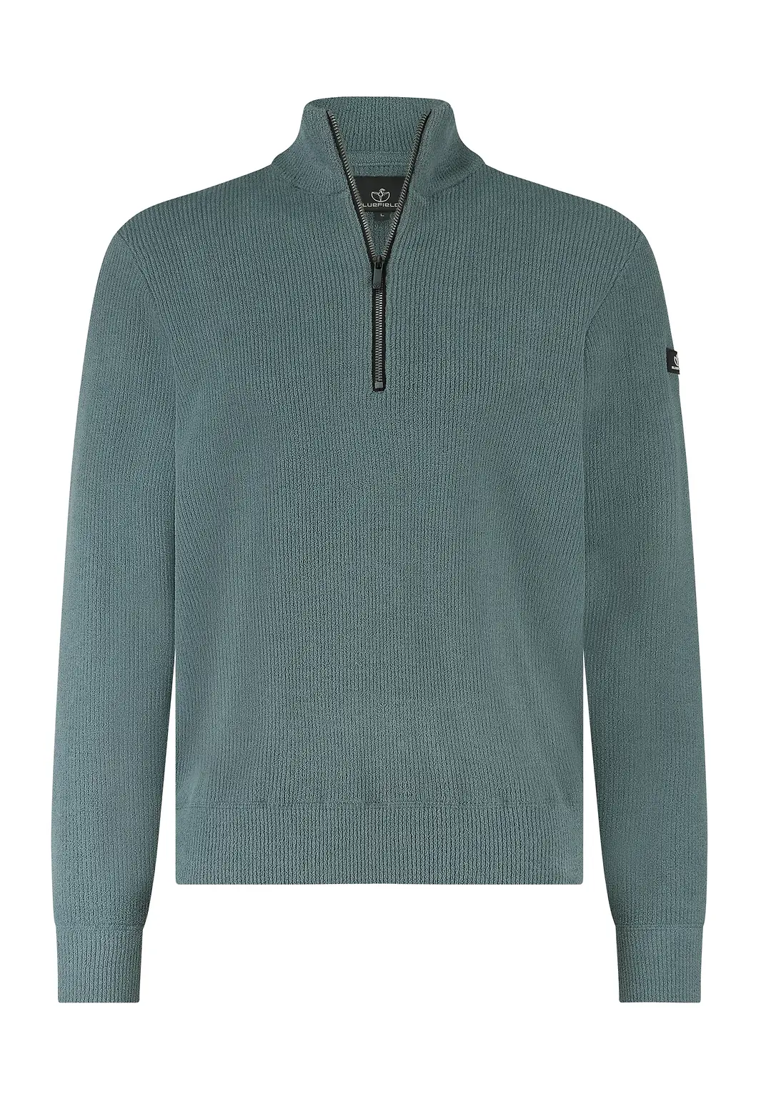 Deze effen trui met halve rits en regular fit is uitgevoerd met een rubberen badge op de mouw en een fijn structuurdessin dat een voelbaar reliëf creëert. De mix van polyester en polyamide zorgt voor een stevig en vormvast breisel dat prettig aanvoelt en subtiel diepte geeft aan het oppervlak.