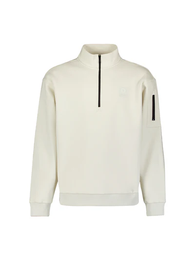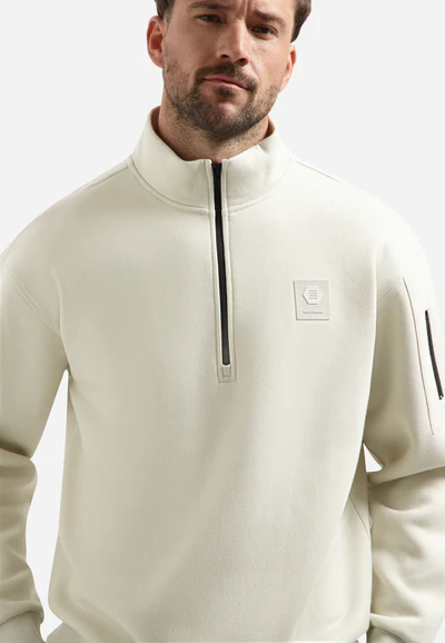 Deze sweater is gemaakt van gestructureerde sweatstof en heeft een sportieve halve rits bij de kraag. De mouwzak en het strakke ontwerp geven hem zowel een functionele als moderne uitstraling. Draag hem met jeans of een cargobroek voor een relaxte, utility-geïnspireerde look.