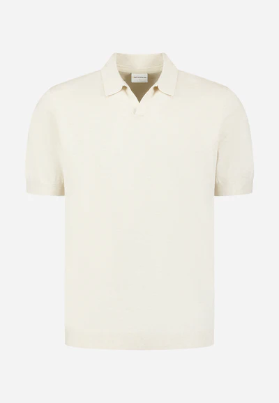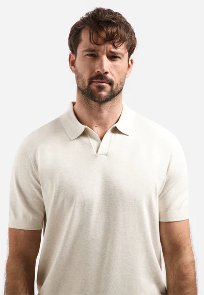 Een zacht gemêleerd poloshirt met korte mouwen en een moderne V-hals zonder knopen. De lichte gebreide stof is comfortabel en luchtig om te dragen en geeft elke outfit een stijlvolle zomerse uitstraling.