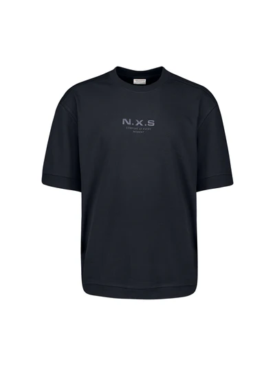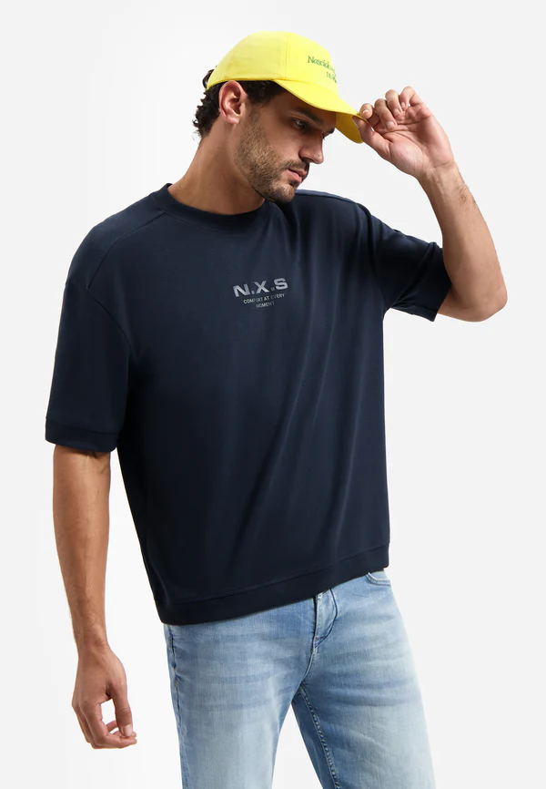 Stevig interlock T-shirt met ribboorden en een comfortabele, relaxte pasvorm. De zware jersey voelt aan als een sweater maar draagt als een T-shirt. Afgewerkt met subtiel artwork op de borst voor een moderne casual look.